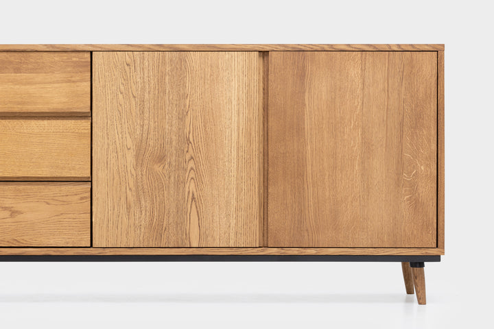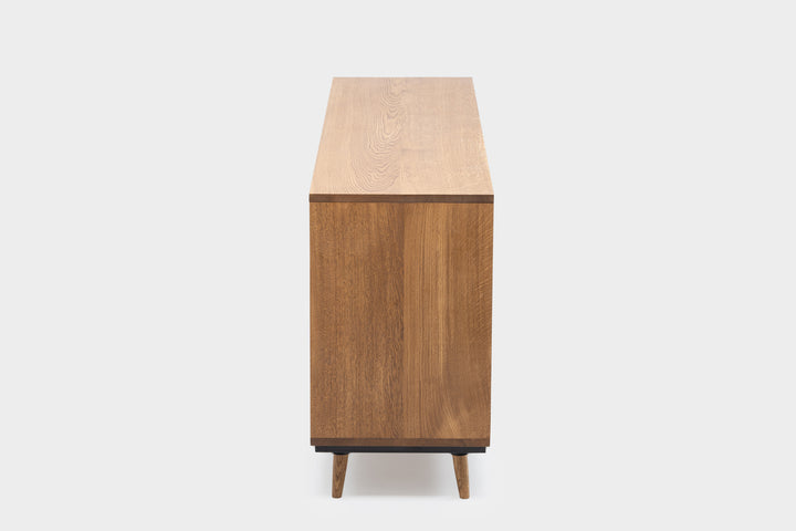 Das elegante Sideboard, inspiriert vom Mid-Century-Design, besteht vollständig aus handgefertigtem Eichenholz und zeichnet sich durch klare Linien aus. Mit seiner niedrigen Höhe wirkt es dezent und fügt sich harmonisch in den Raum ein, ohne ihn zu dominieren. Es verbindet Funktionalität mit Stil und überzeugt durch Robustheit und Stabilität.